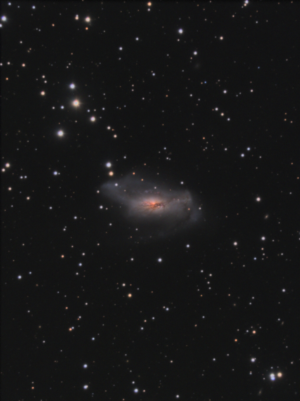 NGC6503 est une petite galaxie, dont la position proche du pôle nord et le faible contraste en facilitent un peu la photographie. C'est ma première photo de galaxie incluant une couche H-alpha et une couche rouge de soustraction